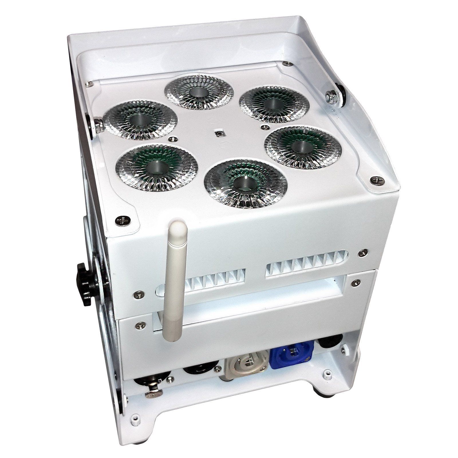 Akku-betriebener LED-Projektor, der auf 6 Stück RGBWA-LEDs mit jeweils 10 Watt basiert, um unerwünschte Farbschatten zu vermeiden.